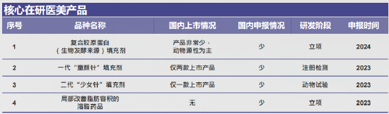 同时,凭借母公司四环医药在医药创新和研发上多年的行业积淀以及强大的研发团队和实力,渼颜空间在北京快速建立了自己的医美研究院,目前拥有数十位专业性强、经验丰富的医美研发团队,据公司公开披露的信息显示,公司目前有多款II类产品以及10余款III类产品管线在研,包括胶原蛋白类产品,一代“童颜针”、二代“少女针”、溶脂类药品等。同时,公司于2021年1月在美国南加州成立Meiyen Lab(渼颜实验室),聚焦于引入海外拥有较高技术壁垒的医美新型技术于公司实验室进行转化,打造渼颜空间自己的创新医美产品管线及品牌。