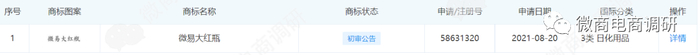 东莞微易网络科技有限公司于2021年8月申请了微易大红瓶的商标,商标分类为日化用品,但目前商标状态是初审公告。而广州白云山敬修堂药业股份有限公司旗下的一款洗头膏正是大红瓶,这款产品也是微易新零售的主打产品之一。