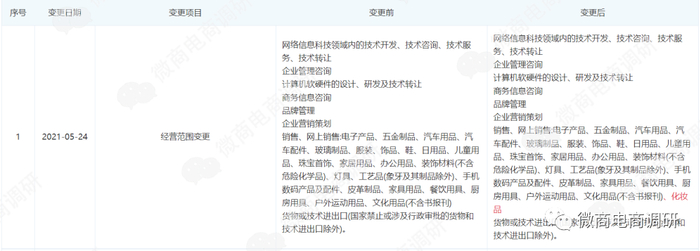 据了解,东莞微易网络科技有限公司成立于2020年7月,法定代表人为王梅,注册资本100万,实缴资本15万,公司的经营范围包含网络信息科技领域内的技术开发、咨询、服务、转让;计算机软硬件的设计、研发及技术转让;货物或技术进出口网上销售:电子产品、户外运动用品、文化用品、化妆品等。调查显示,东莞微易网络科技有限公司于2021年5月进行了经营范围的变更,变更之后公司增加了化妆品销售。