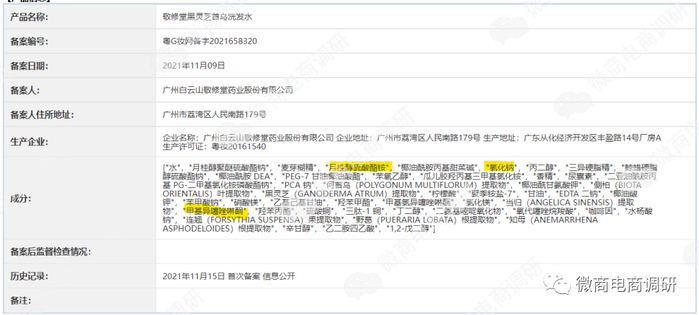 其次,微易新零售第二款主打产品是敬修堂黑灵芝首乌洗发水,俗称小黑瓶。据调查,该款产品外包装上显示的证书编号粤G妆网备字2021658320,由此可见这只是一款普通化妆品,并不是国产特殊用途化妆品,我们从国产普通化妆品备案信息网上调查得知,敬修堂黑灵芝首乌洗发水含有“月桂醇聚醚硫酸酯钠”,它的作用是清洁,但是它的刺激性很强,而且会破坏头发油脂的分泌,让保护的屏障受到损坏,所以容易出现干枯和分叉的问题,还会增加掉发的现象,而且此款洗发水还含有“氯化钠”,这个成分一般会被当做增稠剂,放在洗发水内,不仅会导致脱发,还会使头皮干燥发痒,异常难受,严重的话还会导致脂溢性皮炎。值得注意的是,成分表中竟然还有“甲基氯异噻唑啉酮”,欧盟已经限制使用此款成分,这个成分它是经过化学工艺提炼的,也可以看成是一种防腐剂,但它的致敏性很高,且有一定致癌性,如果使用它会导致头皮瘙痒,然后出现脱屑的问题。