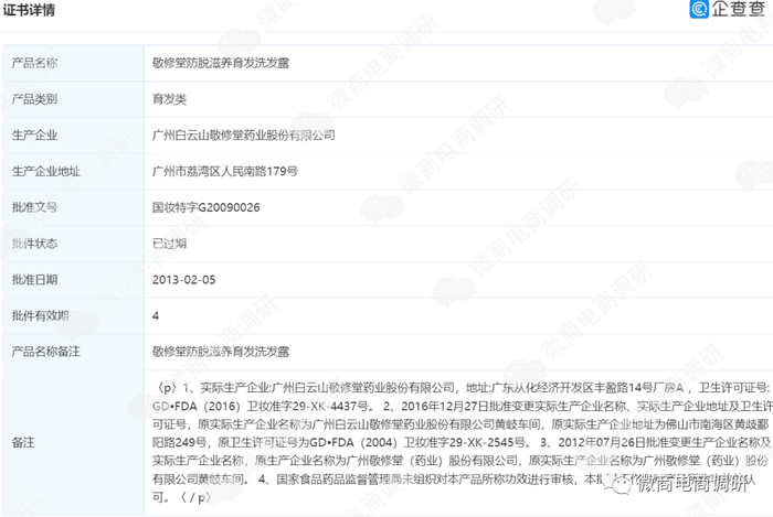 首先,第一款敬修堂防脱滋养育发洗发露是广州白云山敬修堂药业股份有限公司旗下的产品,俗称大红瓶,属于国产非特殊用途化妆品,其功效是防脱滋养。但是调查显示,此款证书明确标注了国家食品药品监督管理局未组织对本产品所称功效进行审核,本批件不作为对产品所称功效的认可。
