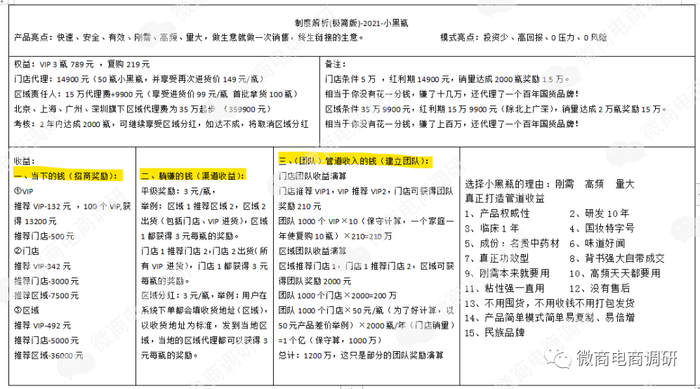 微易新零售将小黑瓶代理分为VIP,门店代理和区域责任人三个级别:VIP需消费789元购买3瓶小黑瓶即可成为VIP,享受复购价219元;门店代理需缴纳14900元,拿货50瓶,享受进货价149元/瓶;区域负责人需缴纳15万代理费,还需额外缴纳9900元,享受进货价99元/瓶,首次拿货100瓶。此外,北京、上海、广州、深圳旗下的区域代理费需35万元以上,2年内达成2000瓶,即可享受区域分红。