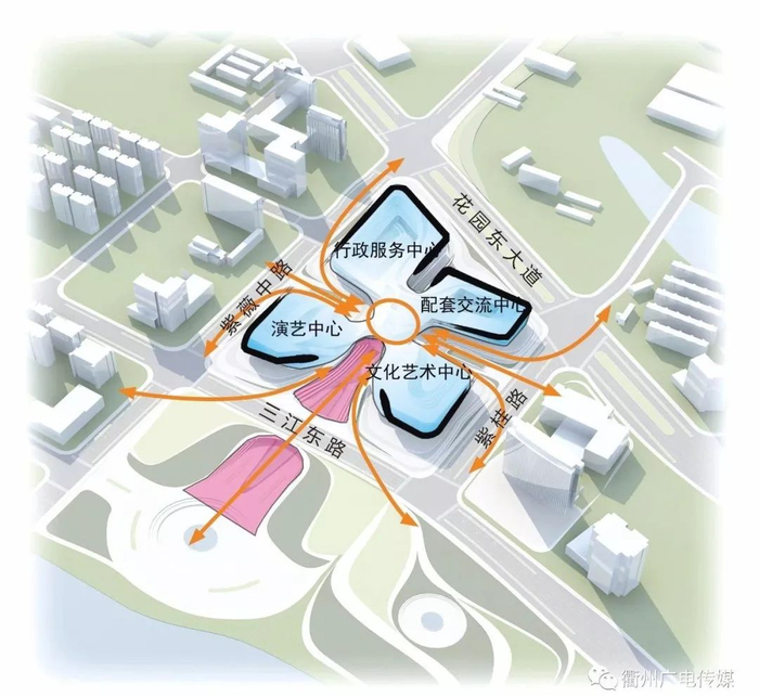 衢州市文化艺术中心和便民服务中心项目位于智慧新城,北至花园大道,东至紫桂路,南到三江东路,西至紫薇中路。项目总用地面积136亩,总建筑面积25.38万平方米。
