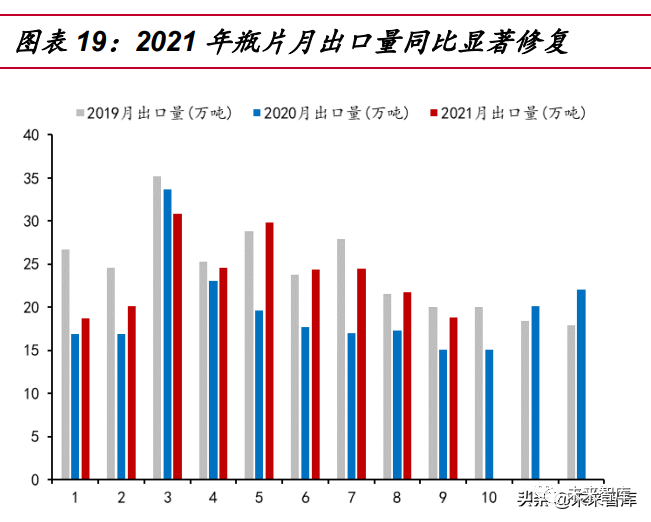 海关出口量数据表明,后疫情时代的瓶片出口正修复至接近 2019 年水平:从 2021 年月度海关数据看,9 个月中有 8 个月的瓶片出口呈现同比增加(其中 7 个月 增幅均超 10%,最高超 50%),仅 3 月同比下降 8.59%,最终前 9 月合计同比增加 20.44%,但相比 2019 年前 9 个月仍落后 8.74%。按月观察可知,2021 年与 2019 年的出口差距总体呈逐月缩小趋势,正逐步修复至 2019 年水平。综合消费及进出口 数据可知,疫情虽然带来了扰动,但并没有影响到瓶片表观消费量的增长趋势,2021 年前 9 个月的表观消费量同比增长 5.23%,相比 2019 年增长 6.17%。