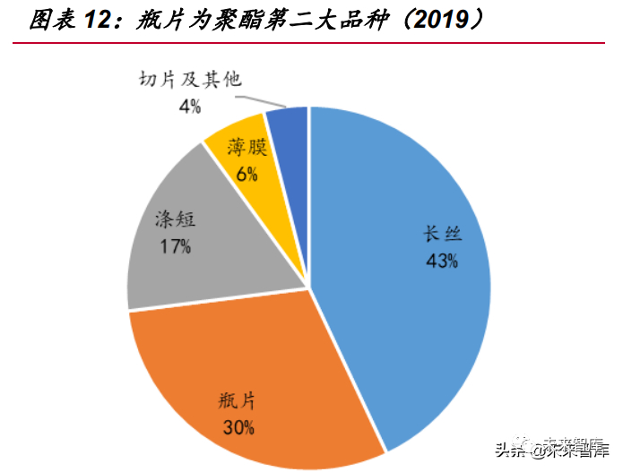 全球聚酯产能若按照产品形态来划分,则涤纶长丝是产能第一大品种,2019 年 全球产能中占比为 43%;聚酯瓶片则是产能仅次于长丝的第二大品种,在全球聚酯 产能中约占 30%,且国内企业产能占到了全球瓶片产能的三分之一,约对应全球聚 酯产能的十分之一;聚酯产能中排第三的为涤纶短纤,占比为 17%,其余产能为聚 酯薄膜(6%)、切片及其他聚酯形态(4%)。虽然目前全球产能中纺织用纤维的比重 仍是最大,但随着产业的升级与替换,用于包装的聚酯占比正在逐步加大:非纤用聚 酯产品——瓶片和薄膜的产能占比近几年已逐步升至 36%附近。