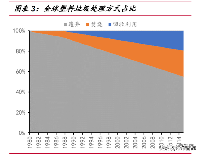 从塑料垃圾处理方式的占比来看,最初的塑料垃圾完全是用后即遗弃的处置方式, 1981 年开始用焚烧法处理一部分的塑料废弃物,再到 1988 年才开始回收部分塑料 垃圾进行再利用。近年塑料垃圾的焚烧与回收利用比例不断提升,至 2015 年,上述 两种处理方式占比分别达 25.5%与 19.5%,仍有半数以上塑料垃圾被遗弃(含填埋)。
