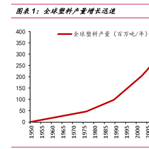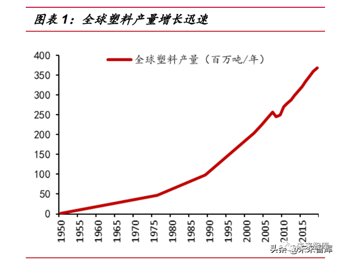 从 1869 年世界第一块塑料——赛璐珞(硝化纤维塑料)诞生至今,塑料已发展 出包含五大通用塑料在内的 140 多种商业化的塑料品种,其中常用品种约有 30 多种。同时,塑料产量的增长也十分可观,尤其是伴随着二战后石油化工工业的迅猛发展, 全球塑料产能从 1950 年的 170 万吨/年已增长至 2019 年的 3.68 亿吨/年,增长了 200 多倍,其增速远大于同时期内的全球 GDP(不变价)的增速。