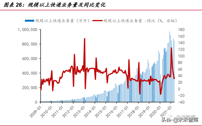 根据 2020 年数据,我国规模以上快递业务总量累计达到 833.60 亿件,同比增 长 31.23%,2010~2020 年快递业务量 10 年内增长约 35 倍,复合增速为 42.95%。2017 年起,快递量增速变得较为平稳,2021 年快递量再次猛增——国家邮政局监测 显示 2021 年全国快递业务量突破 500 亿件(截至 7 月 4 日),接近 2018 年全年水 平。我们保守取 2018~2020 三年平均增速 27.69%作为 2021 年的增速,并进一步 以按年递减 2pct 的速度来预测未来快递量。