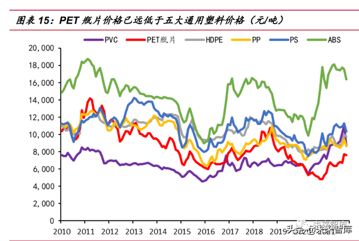回顾过去 10 年聚酯瓶片与五大通用塑料的价格曲线,我们可以看到在 2020 年 前,瓶片与 PP 价格曲线多次交错,一般略低于 PP 价格;同时其与 HDPE 和 PS 仅 在早期发生交错,后期持续低于两者;与 ABS 从未发生价格接近,一直低于其市价 数千元;与 PVC 则是发生过一次价格相交,长期高于其价格近 1000 元/吨。