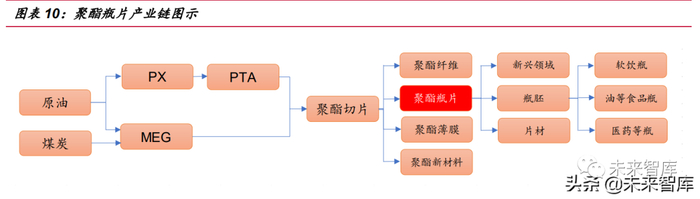 瓶片全称是瓶级聚酯切片,是聚酯的一种产品形态,为聚酯产业链中游产品,主 要应用于制作盛装液体的包装容器。聚酯为聚对苯二甲酸乙二醇酯的简称,英文简称 为 PET,通过精对苯二甲酸(PTA)和乙二醇(MEG)聚合而来。