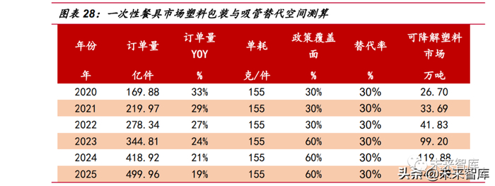 据研究测算,单个塑料碗和塑料饭盒的重量基本在 40~60g 左右,塑料餐勺或 餐叉重 2~3g。有环保组织调研显示每份外卖平均消耗 3.27 个餐盒,我们按照每单 外卖 3 个餐盒(50g/盒)+1 个塑料袋(5g)计算,忽略餐勺等重量,则每单外卖会 产生 155g 废弃塑料。考虑 2025 年地级以上城市餐饮外卖领域不可降解一次性塑料 餐具消耗强度下降 30%的目标,则测算出至 2025 年外卖订单领域可降解塑料替代空 间为 139.49 万吨。同时数据显示,2019 年全国塑料制品累计产量 8184 万吨,其中 塑料吸管近 3 万吨,则外卖领域一次性餐具及塑料吸管的替代空间为 142 万吨。