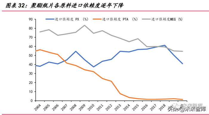 此前 PTA-聚酯产业链受制于高企的上游原材料进口依赖度,产业链的大部分利 润往往被海外上游原料 PX(对二甲苯)、MEG(乙二醇)的生产企业所瓜分。然而, 随着近几年内国内民营大炼化等的加速扩产以及国内煤制乙二醇产能的集中建设落 地,PX 及 MEG 的进口依赖度在近年呈现出显著的下降趋势:MEG 的进口依赖度已 从高峰时期的 83%降至 55%,下降了 28 个 pct,PX 依赖度也从 61%降至 41%,下 降了 20 个 pct,并且随着后面浙石化二期和盛虹炼化的相继投产,PX 进口依赖度有 望继续下降,使得聚酯上游原料的供应进一步宽松化。这一趋势使得瓶片的成本端存 在改善的预期,有利于聚酯产业链利润向下游移动。