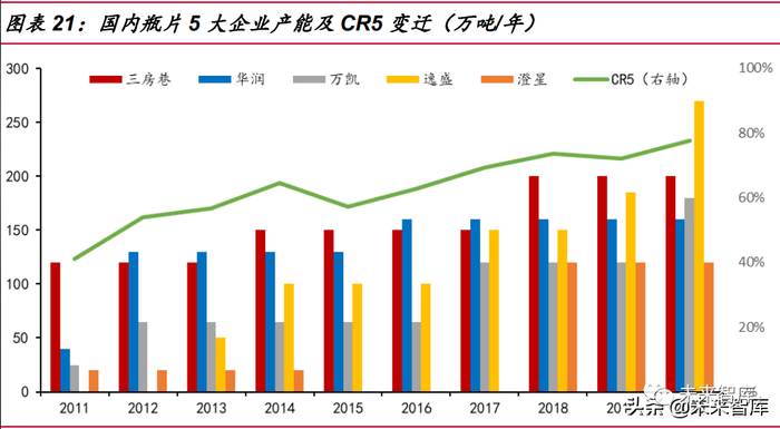 中国的瓶片总产能位列世界首位,其中国内的 5 大瓶片生产企业三房巷、华润、 万凯、逸盛、澄星对行业具有举足轻重的影响力:五家企业的产能持续不断进行扩张, 10 年内从 205 万吨扩张至 930 万吨,年复合增长率达 16%。同时五家企业集中率 (CR5)也保持较快增速,从 2011 年 5 家企业瓶片产能总和占到国内瓶片行业产能 的 41%,到 2020 年达到 77.56%,接近翻倍。市场结构的类型属于极高寡占型 (CR8≥70%),龙头在市场中的话语权日益提高。