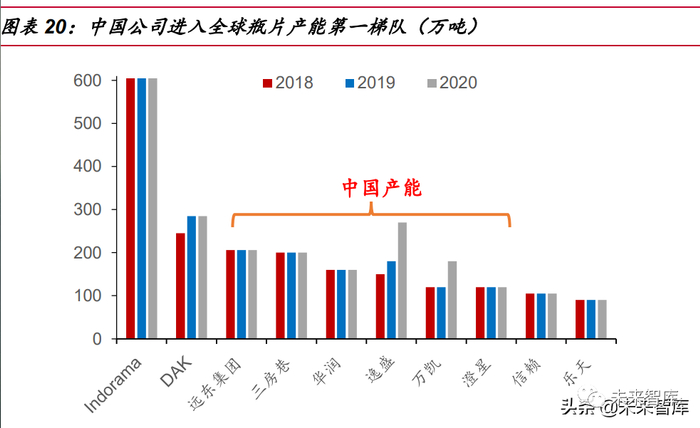 根据部分企业/咨询机构所披露的行业巨头的扩产计划以及中远期的战略规划, 未来 5 年内包括三房巷、华润材料在内的国内企业还将进一步扩产,其扩张的速度要 快于海外巨头 Indorama 和 DAK,从而使得国内企业产能的世界排名进一步上升,令 中国区域产能的市占率进一步扩大、市场话语权得到进一步提升。从过去十多年的扩 张轨迹,再到未来数年的战略安排,从中可以看出国内瓶片巨头正是通过控制良好的 扩产节奏,在一步步提升产能的同时树立起了行业竞争壁垒。