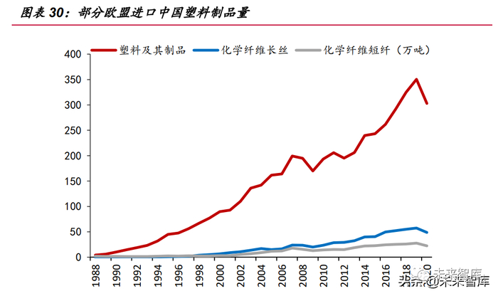 除了上述的中短期政策驱动带来的国内市场替代空间,由于我国是全球制造与出 口大国,有大量外贸塑料制品以及聚酯纤维纺服产品是用于出口的,受欧盟等地区及国家的政策影响,这些产品均面临欧美等发达国家与地区的可降解政策升级。