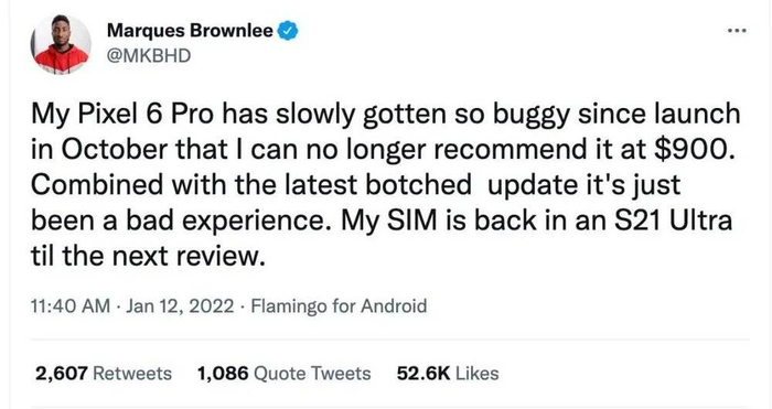 谁也没想到 Android 系统这个老队友在关键时刻掉了链子,不断出现的 bug 正在一步一步消磨机主们的耐心,知名博主 MKBHD 也在 Twitter 表示因为系统更新问题,他收回对 Pixel 6 Pro 这台机子的推荐。