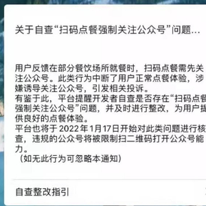 2021年12月18日,上海市消保委发布消息,称腾讯公司向开发者推送了关于自查“扫码点餐强制关注公众号”问题的通知。通知表示,微信平台提醒开发者自查是否存在“扫码点餐强制关注公众号”问题,并及时进行整改,平台将于 2022 年1月17日开始对此类问题进行核查,违规的公众号将被限制二维码打开公众号功能。对于消费者而言,从1月17日开始,就应该不会被强制关注公众号才能点餐。
