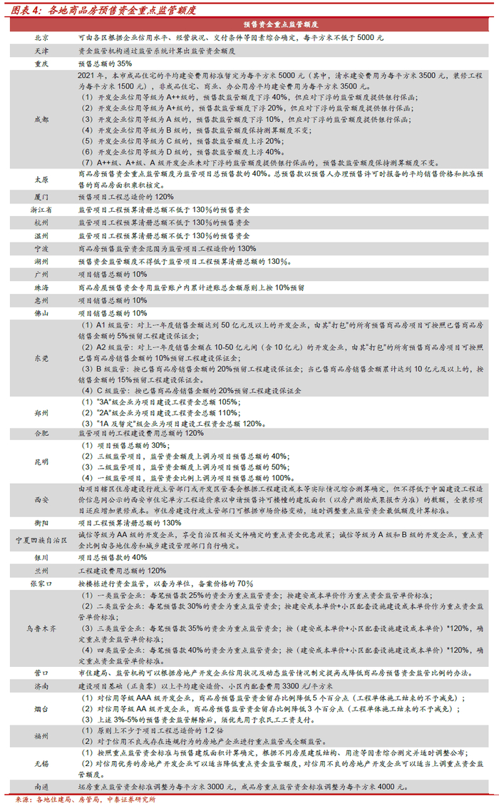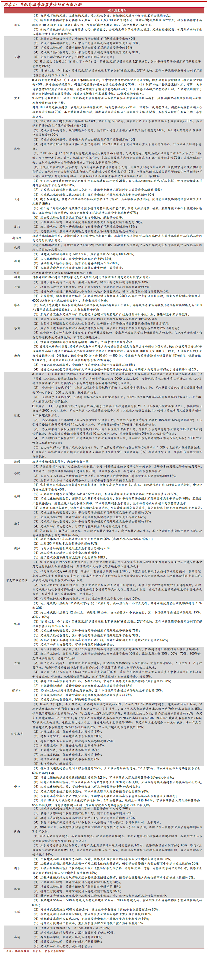 北京、天津、重庆、昆明、西安、银川、无锡、张家口、乌鲁木齐、营口、无锡等地对不同高度建筑的工程节点做了细分,增加了高层建筑的工程节点。佛山、东莞、宁夏回族自治区等地根据不同信用评级的房企调整了重点资金最低留存比例。杭州省(杭州、宁波、湖州)、郑州等地则没有明确的划分,而是要求房企应逐季编制用款计划,并按计划分次向监管银行提出申请。