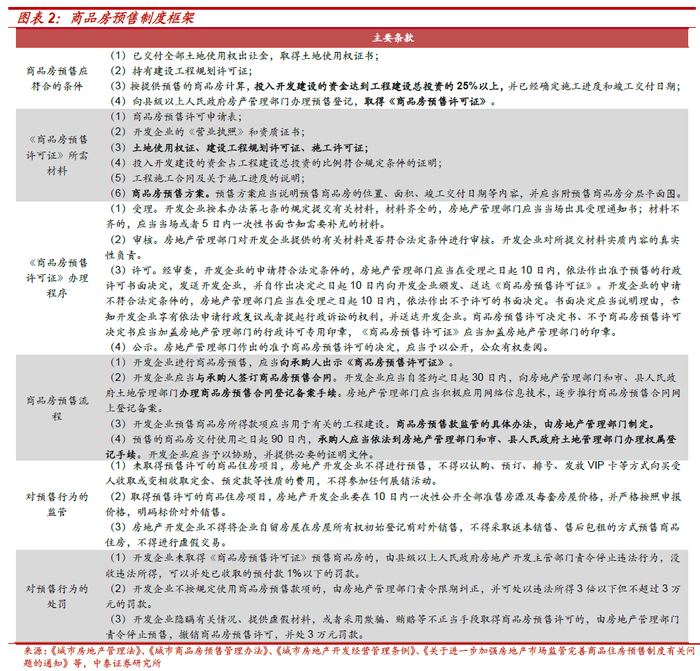 《城市房地产管理法》《城市商品房预售管理办法》等文件构建了预售制度的基本监管框架,包括预售条件、预售流程、预售监管等。