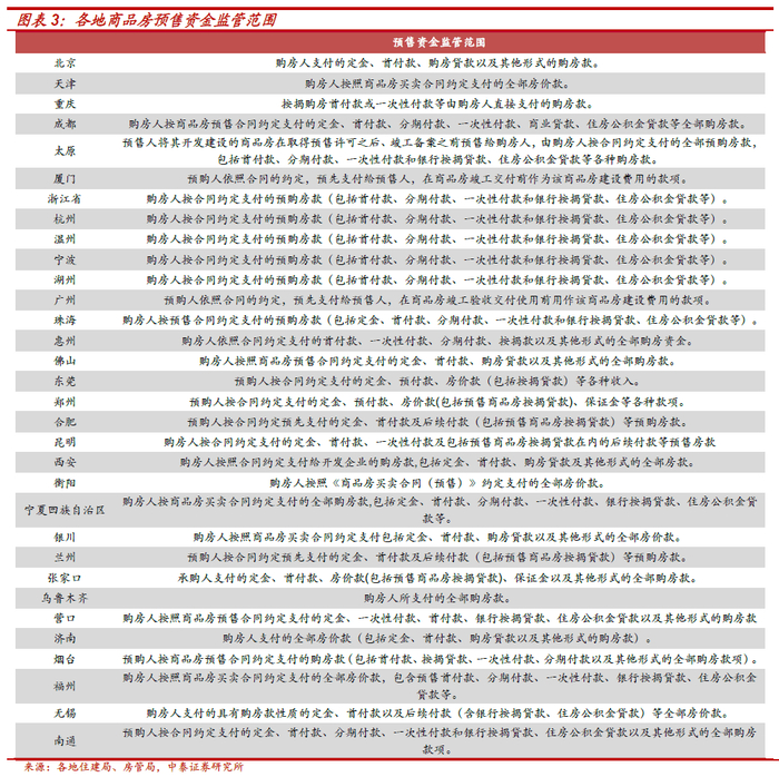 从预售资金监管来看,目前没有全国统一的规定。《城市商品房预售管理办法》明确“商品房预售款监管的具体办法,由房地产管理部门制定”,意味着在预售资金监管方面,各地区基本施行“一城一策”的思路,即各地区基本会出台相应的“预售资金监督管理办法”和“预售资金监督管理实施细则”,并按照“重点监管资金+一般监管资金”的框架进行监管。