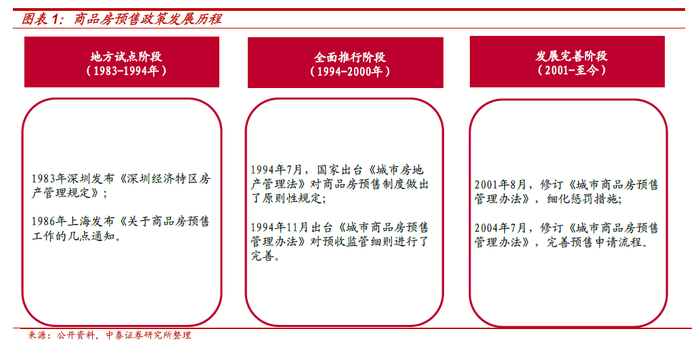 商品房预售制度1956年起源于香港(又称“预售楼花”)。1983年深圳率先开始商品房预售试点,1986年上海也开始进行商品房预售试点。1994年7月,国家出台的《城市房地产管理法》和11月出台的《城市商品房预售管理办法》(分别于2001年和2004年进行修订)建了预售制度的基本监管框架,包括预售条件、预售流程、预售监管等。