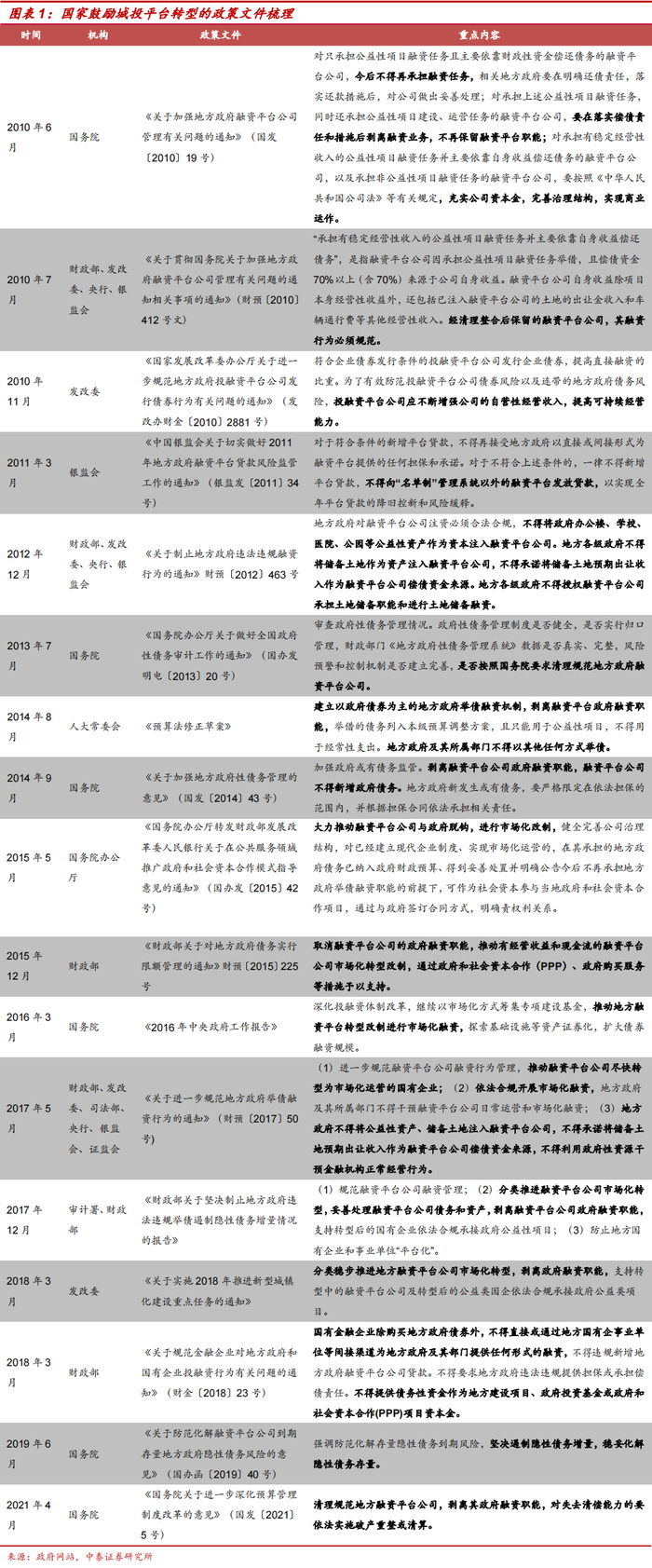 在新预算法和43号文之后,又有一系列文件要求推进城投平台的转型,如国办发〔2015〕42号要求大力推动融资平台公司与政府脱钩,财预〔2017〕50号文件要求推动融资平台公司尽快转型为市场化运营的国有企业,国发〔2021〕5号文要求清理规范地方融资平台公司,剥离其政府融资职能,银保监发〔2021〕15号文提出严禁新增隐性债务,高度重视地方政府债务风险。