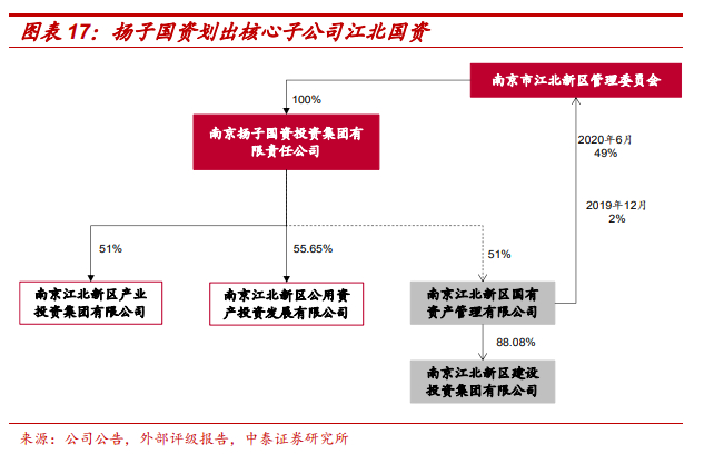 2019年11月21日,扬子国资发布《南京扬子国资投资集团有限责任公司关于子公司股权结构调整及资产注入相关事项的公告》,为加快推动江北新主城建设步伐,进一步优化新区国有资本布局,提升国有资本配置效率,2020年6月底之前,扬子国资需将其持有的江北国资51%的股权分2步划转给新区管委会,同时江北新区管委会无偿划转四家子公司100%股权及落实103亿元货币资金分步注入扬子国资及其核心子公司。