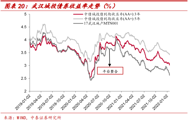 受益于股权合并,公司经营规模和综合竞争实力增强,在区域内的地位进一步提升。公司获得政府支持的力度有所提升:2020年,公司本部收到武汉市国资委投入的国有资本金14.97亿元、武汉市人民政府拨付的城建资金14.34亿元以及土地收益返还3.35亿元。政府补助方面,2018-2020年政府补助分别为230万,514万元,1.72亿元。从收益率角度来看,平台整合对武汉城投债券收益率影响并不大,尽管平台整合提高了公司在当地的地位,扩大资产规模,但由于武汉市整体经济财政实力较强,市场认可程度也较高,债券收益率处于较低水平,因此整合事件并不足以对债券估值产生很大的影响。