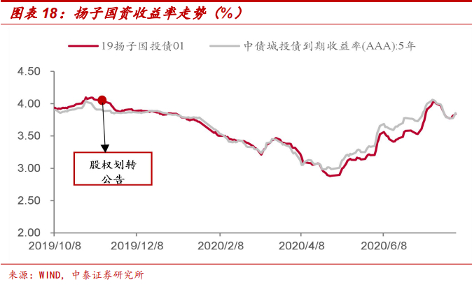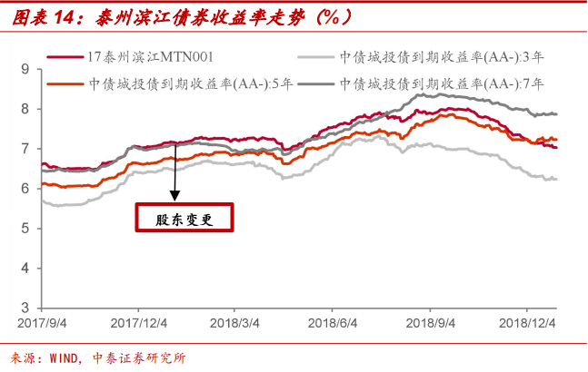 股权变更后,公司职能定位和经营范围未发生变化,公司仍是泰州市泰州滨江工业园区唯一的城市基础设施建设主体,承担着泰州滨江工业园区内基建项目的投资、融资、建设、运营和管理职能。根据公司2018年和2019年的外部评级报告,公司所获外部支持仍来自于泰州市医药高新区及其下属的泰州滨江工业园区。从相关债券的收益率来看,泰州滨江上划股权对估值的影响较小,其收益率仍处于较高的位置。