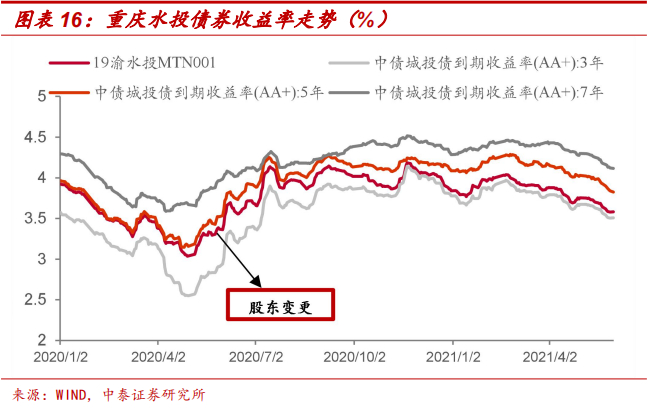 2020年5月12日,重庆水投发布《重庆水利投资(集团)有限公司关于控股股东变更进展的公告》,重庆水务资产经营公司将持有的重庆水投100%股权无偿划转至重庆市国资委持有。2020年,公司在财政补贴、土地出让金返还、财政拨款等方面得到政府支持的力度加强,政府补助收入从2019年的1800万元增长到2.03亿元,财政拨款20.34亿元计入资本公积。从“19渝水投MTN001”的收益率来看,股权划转对其估值没有明显的影响。