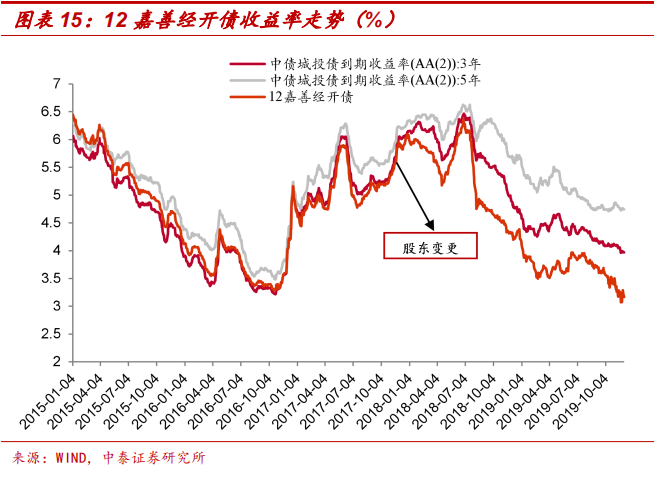 2017年11月,根据嘉善县人民政府将嘉实经开100%股权无偿划转给嘉善经开区管委会(65%)和嘉善县国有资产投资有限公司(35%)。本次变更主要原因如下:(1)嘉善经开主要从事嘉善经开区范围内的土地一级开发业务,而嘉善经开区管委会系嘉善经开区的主管机构。本次股权划拨后,公司的控股权与业务定位相匹配,将有利于管委会依据经开区范围内土地需求,进行土地综合整治工作,并将促进公司土地开发业务的盈利能力和持续经营能力。(2)嘉善县国有资产投资有限公司主要从事国有资产管理、土地整理开发等基础设施建设业务,相关基建经验丰富。本次参股后,将有利于整合资源,进一步提升嘉善经开土地整理开发业务综合专业管理能力。从估值的角度来看,股权划转对于嘉善经开收益率的影响并不显著,12嘉善经开债在股东变更前后基本与对应收益率曲线走势保持一致。