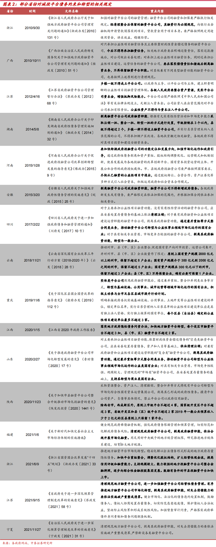 为了贯彻中央精神,使得融资平台公司符合监管要求,部分省份专门制定了相应的平台公司转型、整合的文件,引导平台公司进行市场化改制和资产重组。各区域文件重点主要在以下方面:(1)根据不同级别的行政区划对区域平台的数量做出了规定,从而推动区域内平台整合;(2)对具有不同业务属性的平台提出了转型要求;(3)剥离平台政府融资职能,切断政府与平台的新增债务联系。