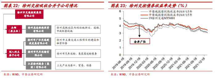 2019年末,徐州交控合并交通局下发债主体广弘公司(外部主体评级AA+),公司资产规模大幅增长(2019年末徐州交控资产规模438.98亿元,广弘公司147.79亿元),主体地位明显增强,从“19徐州交通MTN001”的收益率走势来看,其债券收益率出现明显下行。平台整合提高了公司区域地位,扩大了资产规模,相关主体市场认可程度亦有所提高。