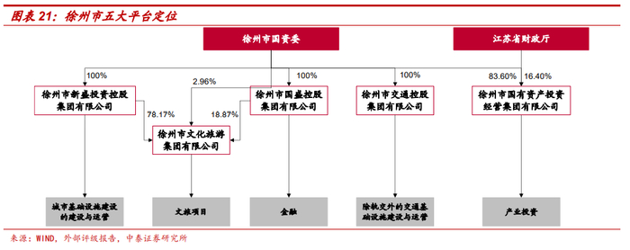 根据《中共徐州市委徐州市人民政府关于深化市属国有企业改革工作的指导意见》,徐州市对市级国资公司重组整合,组建五家集团:徐州城建(以徐州新盛为主体组建)、徐州交控、徐州文旅、徐州产投(以徐州国投为主体组建)和徐州国盛。整合完成后,徐州新盛主要承担城市基建项目的投资建设、徐州交控负责市内除轨道交通外的交通基础设施建设和运营、徐州文旅主要业务为文旅项目投资、徐州国投以产业投资为主要方向、徐州国盛将打造金融控股集团,五大平台分工明确,实现了平台差异化经营的目标。