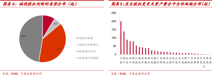 2.3平台股权从政府部门划转到另一家平台和2.4平台股权在区域内不同城投公司之间划转往往涉及平台整合,主要原因有以下2点:(1)部分地区平台数量多且分散,一些小平台市场认可度较低,发展受限。为了做大做强平台公司,使其在融资方面更具优势,提高资源利用效率,地方政府会将区域内绝大多数平台整合成一个大型综合性城投集团,或者让区域内资质较好的平台吸收合并资质相对较弱的平台,提高整体综合实力。(2)部分地区城投平台业务范围重叠度高,通过按不同功能定位重组形成专业集团,既可以避免业务相似的城投平台之间不必要的竞争,又可以整合区域资源优势,发挥业务的协同效应。