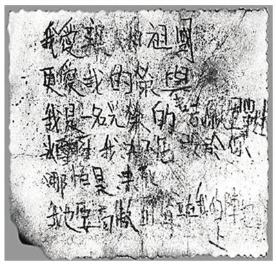 志愿军的追击部队抵达水门桥的时候,他们目睹了自己战友悲壮的场面。在冻死的战士中,有一位来自上海的战士名叫宋阿毛,在他的上衣兜里找到了一张纸片,写着这样一段话:我爱亲人和祖国,更爱我的荣誉,我是一名光荣的志愿军战士,冰雪啊!我决不屈服于你,哪怕是冻死,我也要高傲的,耸立在我的阵地上……