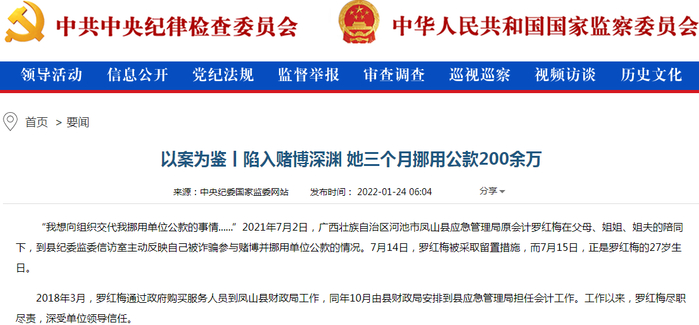 中央纪委国家监委网站1月24日发布“以案为鉴”文章,讲述一名女会计陷入赌博深渊,三个月挪用公款200余万的案例。