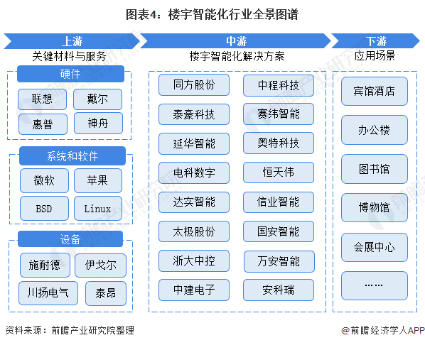 楼宇智能化行业的上游主要包含硬件、系统和软件及设备等,硬件行业的主要参与者有联想、戴尔、惠普和神舟等;而系统和软件行业的主要参与者有微软、苹果、Linux和BSD;设备行业的主要参与者有施耐德、伊戈尔、川扬电气和泰昂等公司。行业的中游参与者较多,主要有同方股份、泰豪科技、、延华智能、电科数字和达实智能等公司。
