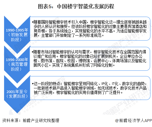 在我国,楼宇智能化起源于20世纪90年代,起步较晚,但发展迅速。中国楼宇智能化的发展前后大体经历过三个阶段,分别是初始发展阶段、规范管理阶段和发展阶段。