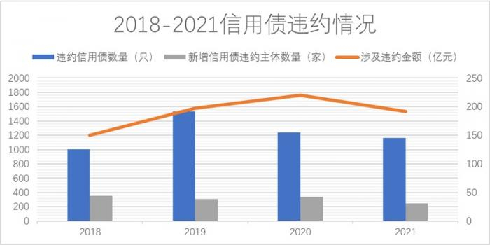 2021年的境内信用债累计违约金额三年来首次出现下降。2021年,共计45家境内发债主体(含首次和非首次违约)发生违约,涉及违约债券145只,违约总额约1536.93亿元,相较2020年减少12.56%。而2018年-2020年,累计违约信用债分别为126只、192只、155只,涉及违约金额分别为1204.4亿元、1583.39亿元、1757.72亿元。若将展期的境内信用债998亿元统计在内,2021年境内信用债违约总额约2535亿元。