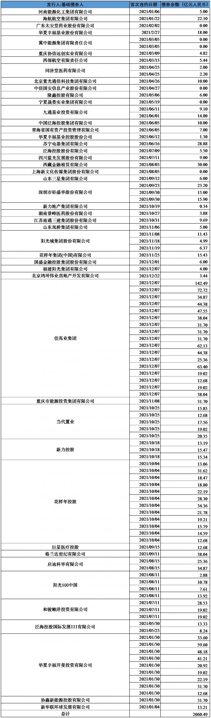 需要说明的是,本文所指的违约类型,包括实质性违约、交叉违约、技术性违约等;违约事件包括本金违约、利息违约、本金利息同时违约、回售款违约、利息回售款违约、加速清偿到期违约、交叉违约和破产等情况。尽管美元债交换要约获得同意并不等于发生实质性违约,但因其反映出发债主体资金链较为紧张,可视为变相展期,我们也将在2021年内提出美元债交换要约并获得持有人同意的发债主体统计在内。