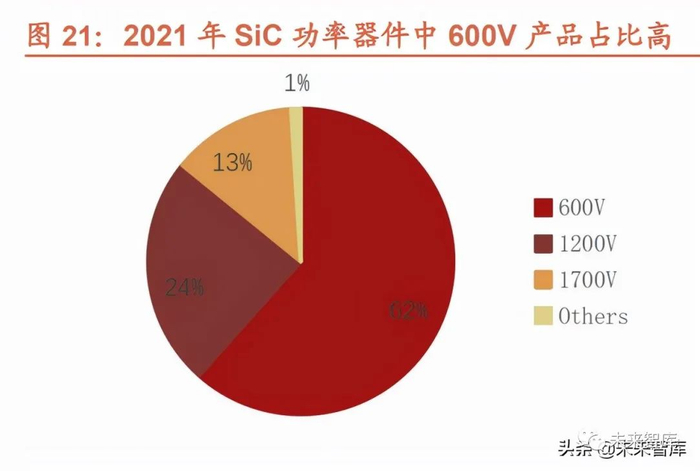 1200V 碳化硅功率产品用量将增加。目前,600V 产品份额高达 61%,主要由于 Tesla 大量使用 600V 碳化硅产品, 并在电动车上大量使用,占据了主要市场份额。而随着比亚迪汉、现代 Ioniq 5 等电动车推出使用 1200V 碳化硅产品, 以及后续 800V 电压平台推广,预计 1200V 碳化硅产品将占据主要的增量市场。此外,通讯、光伏、工业等领域也将 以 1200V 碳化硅产品为主。据 Yole 数据,预计 2026 年 1200V 碳化硅产品占比将达 49%。
