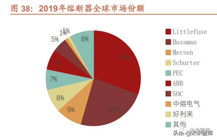在新能源汽车领域,熔断器集中度较高,中熔电气为国内第一。根据中国电动车百人会,2019 年主流整车企业中, 中熔、Bussmann、Mersen 占比分别为 55%、30%、10%,CR3 占比达到 95%。
