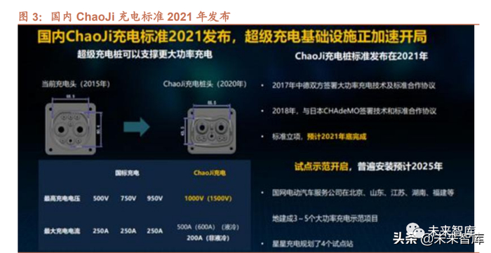 国内 ChaoJi 充电标准 2021 年发布,超级充电基础设施加速布局。ChaoJi 充电源自中国大功率充电研究,并与德国、 日本交流推进,可支持 350kW-900KW 大功率充电,充电电压 1000-1500V,充电电流 500-600A,10 分钟增加续航 300 公里以上。新一代的 ChaoJi 充电技术路线发端于电动汽车大功率充电需求,但并不简单指大功率充电接口,而 是一套完整的电动汽车直流充电系统解决方案。立项标准预计 2021 年底完成,并开启试点示范,预计 2025 年普遍 安装。