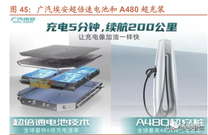 车端:2021 年广汽科技日上,广汽集团展示了最新的超级快充技术,其中分为 3C 和 6C 两个版本,6C 高倍率快充技术可以实现 0-80%SOC 只需 8 分钟,30-80%SOC 只需 5 分钟。电芯方面:海绵硅负极片电池和超级快充电池技 术;即将量产的车型,电芯能量密度大于 280wh/kg,电池续航超 1000km,未来电芯能量密度还将超过 315wh/kg。能效方面,220-480kW 充电功率,充电 8 分钟,续航 200-400km。桩端:480kW 充电桩,并大规模布局,预计到 2025 年,广汽埃安将会在全国 300 个城市建设 2000 座超充站,渗透 至地级市,实现全覆盖。快充车型:AION V Plus,2021 年 9月 29 日上市。
