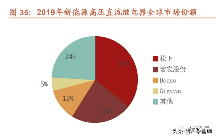 国内市场自主引领,竞争力较强。高压直流继电器全球市场集中度较高,CR3 占据了 70%以上市场份额;其中国内 继电器龙头宏发股份占比达 23%、市占率全球第二(仅次于松下 36%)。受益于国内新能源车自主品牌和充电桩的先 发优势,高压直流继电器国内市场由自主品牌主导,2019 年宏发股份、比亚迪、上海西艾等占据约 75%国内市场份 额,其中单宏发股份一家市占率达 40%,比亚迪、上海西艾市占率分别为 25%/10%,呈现一超多强格局。