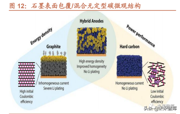 负极改性或使用硅碳负极。动力电池快充性能的掣肘在于负极,一方面石墨材料的层状结构,导致锂离子只能从端面 进入,离子传输路径长;另一方面石墨电极电位低,高倍率快充下石墨电极极化大,电位容易降到 0V 以下而析锂。一方面可以通过石墨改性解决,即表面包覆、混合无定型碳,无定型碳内部为高度无序的碳层结构,可以实现 Li+的 快速嵌入;另一方面是使用硅负极,理论容量高(4200mAh/g,远大于碳材料的 372mAh/g),嵌锂电位高——析锂 风险小——可以承受更大的充电电流。