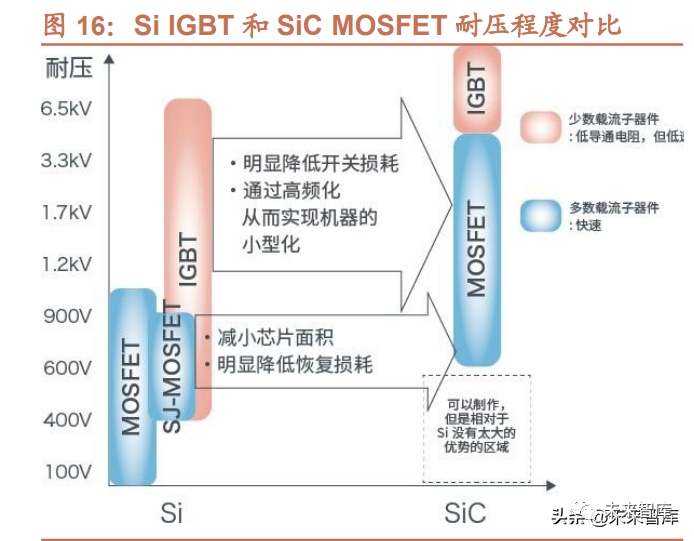 SiC 功率器件不仅在耐压和损耗水平上都能满足 800V 以及更高电压平台的需求,还具备其他方面的优势。总体上, 对比硅基器件,SiC 功率器件主要有三大优势: