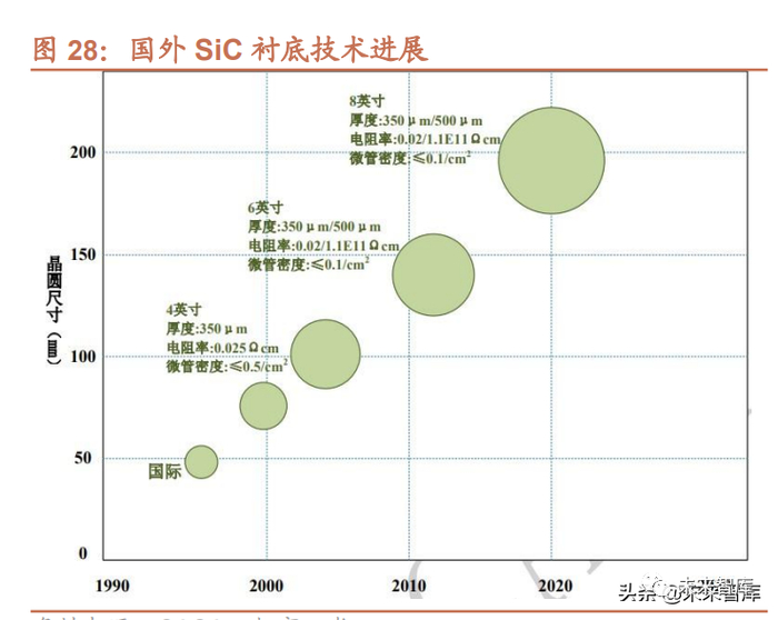 国内衬底厂商虽在产品规格和技术成熟度上有差距,但存在较大追赶可能。目前国产 SiC 衬底已经实现微管密度小于 1 个/cm2,衬底面积 95%可用,位错约在 103/cm2;虽然在单晶一致性、成品率方面与国际先进水平仍有差距,但 未来可期。