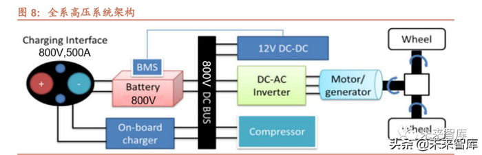 目前预计能实现大功率快充的高压系统架构共有三类,全系高压有望成为主流: